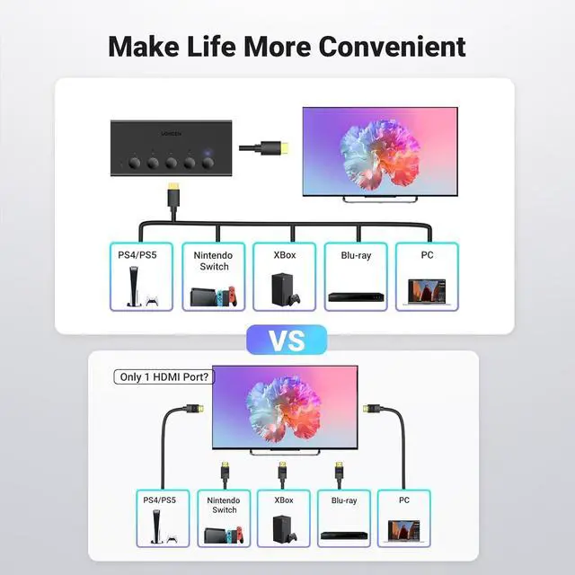 Designed for Multiple Gaming Consoles: Are you tired of constantly switching among multiple gaming devices on your TV? UGREEN HDMI Switch 5 in 1 out makes it a breeze! Connect 5 of your favorite gaming devices such as PS5, Xbox, Switch, Roku, and laptop to your TV with just one input port