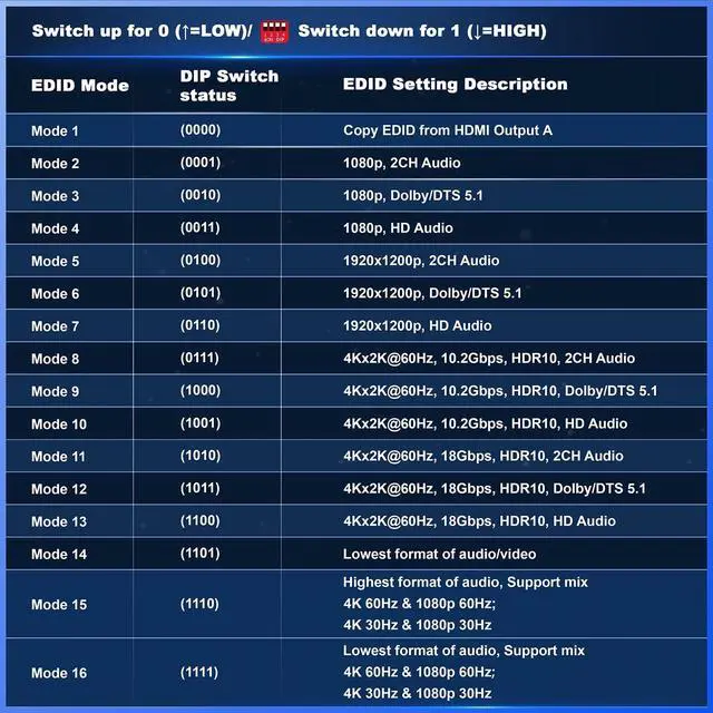 Support ARC, Audio Extractor, Downscale & EDIDARC: Only Output A support ARC. Audio Extractor: Enables audio extraction from HDMI Output A and Output B, and simultaneously splits it to Toslink and 3.5mm. Downscale: When in 1x2, 1x3, or 1x4 splitter mode, it can downscale the input 4K (4K@60Hz 4:4:4/4:2:2/4:2:0 HDR 10) to 1080p on 1080p FHD displays while simultaneously outputting 4K on 4K displays. EDID: Presents 16 manual EDID setting options to ensure compatibility between different devices. Note: To use the ARC function, please connect OUTPUT A directly to the TV's HDMI ARC port.