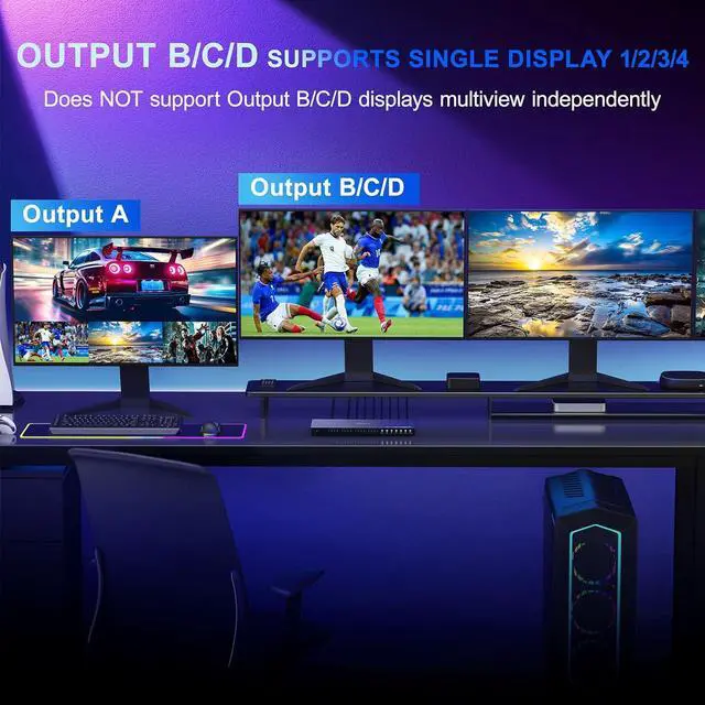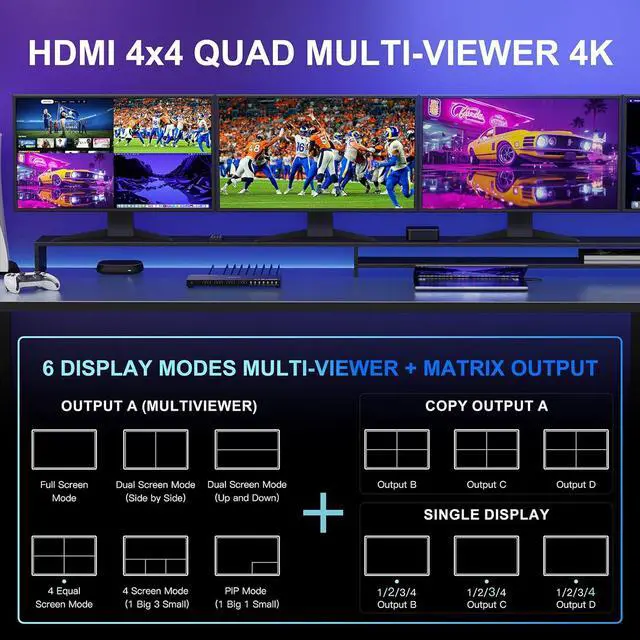 4x4 HDMI Matrix The 4K HDR HDMI Matrix supports a matrix switch between 4 input devices onto 4 output displays, the 4 output signals can be the same or different. Perfect for lecture halls, conferences, CCTV security monitoring, Gaming centers, and exhibitions, etc. NOTE: Support PC/Laptop SST mode only, does not support MST mode.