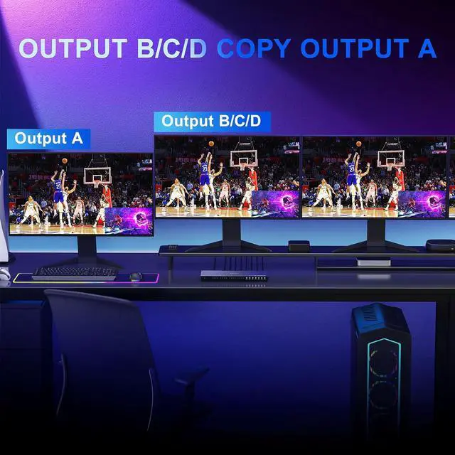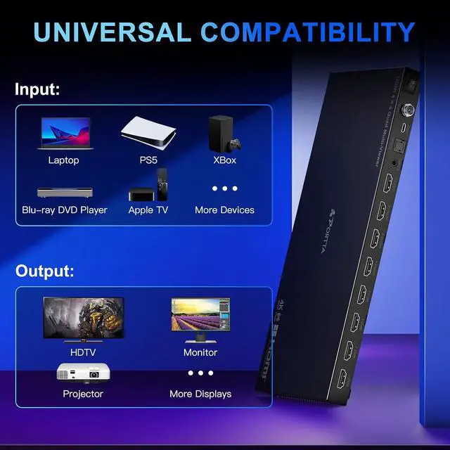 Broad CompatibilityThe PORTTA HDMI 4x4 Matrix is compatible with PS5, PS4, PS4 Pro, PC, Blu-Ray Players, computers, laptops, HDTVs, projectors, monitors, and more.