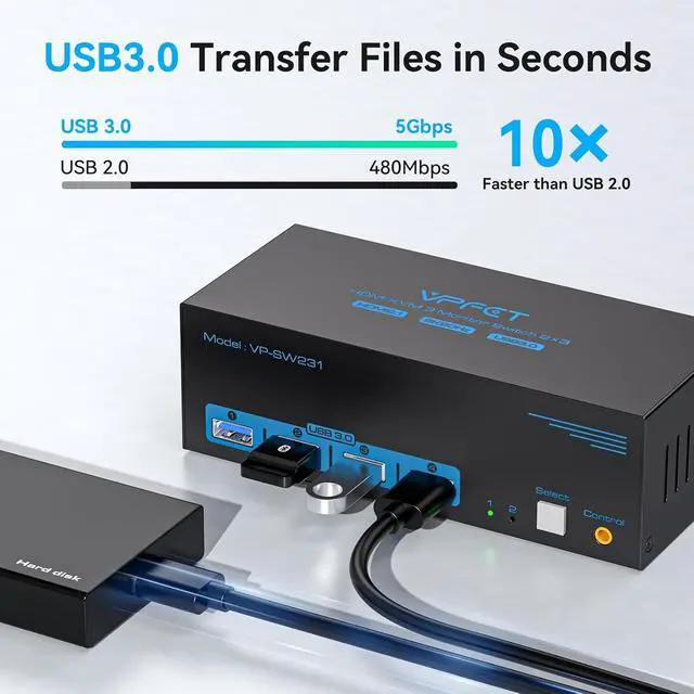 The integrated USB 3.0 hub with four ports allows users to share peripherals such as keyboards, mice, external storage devices, and printers between both connected computers. High-speed USB connectivity ensures reliable data transfer and stable device operation.