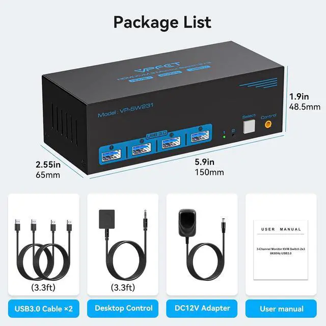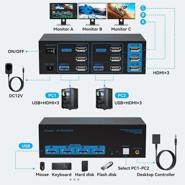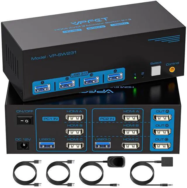 For convenient control, the device includes a wired switching controller that allows users to change between computers quickly without reaching the main unit. The included DC 12V/1A power adapter provides stable power for consistent performance. This triple-monitor KVM switch offers a practical solution for professionals and advanced users who need to efficiently manage multiple computers and displays from a single workstation.