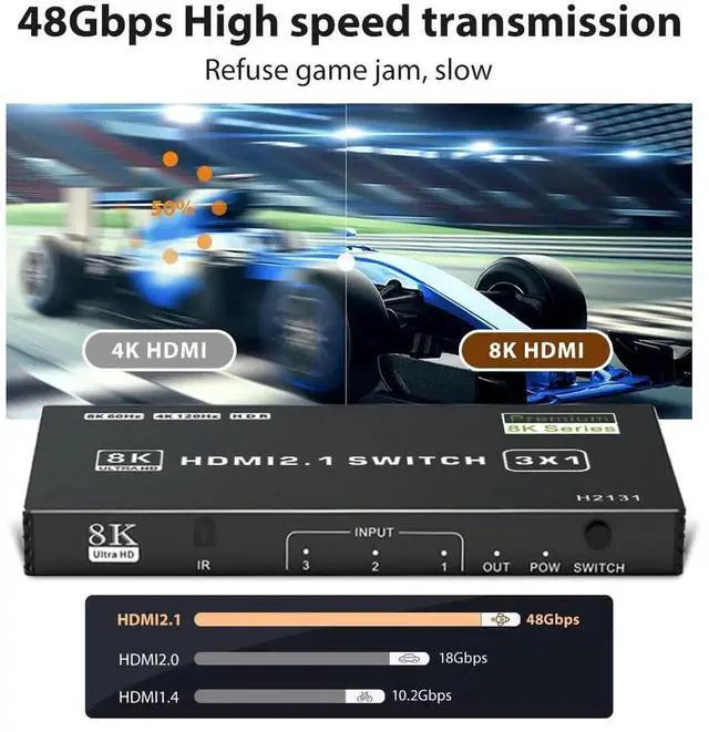This 3 in 1 out 48Gbps HDMI 2.1 Switcher is more powerful than former HDMI 2.0 version, 8K resolution makes it perfectly fits you latest gaming console like PS5, Xbox series X. Seamless switching among 3 input signals within seconds