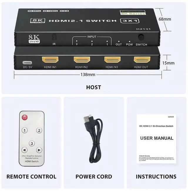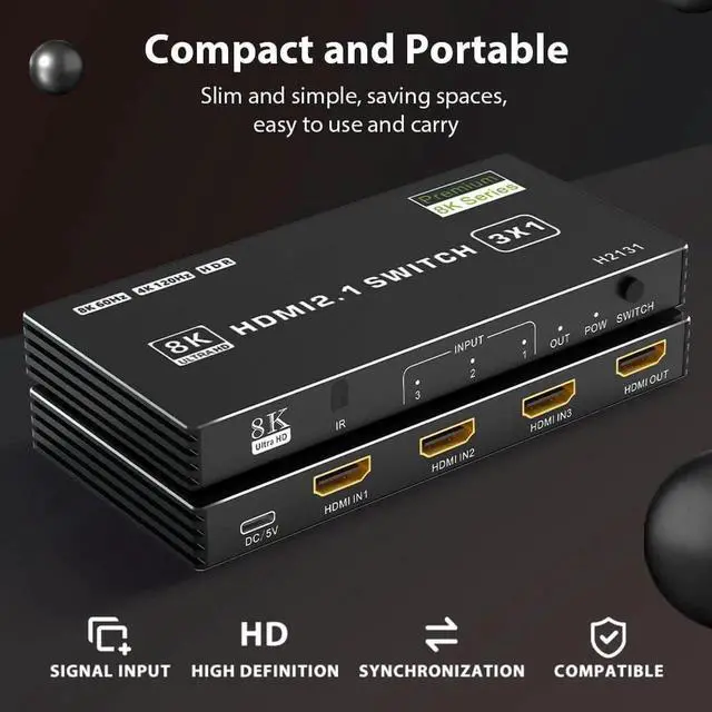 • HDMI Switch 3 in 1 out: Vszerda 8K 3x1 HDMI2.1 Switch can connects up to 3 HDMI video sources to a single display and switch. Features with two switching methods, manual switch and remote control, which frees you from plugging and unplugging HDMI cables