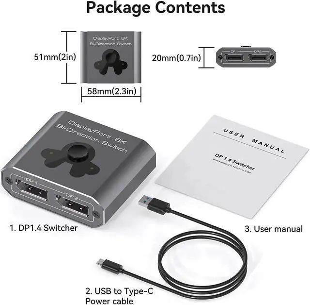 The DisplayPort switcher allow you to connect two DP source to one DP display or connect one DisplayPort source to toggle between two displays.