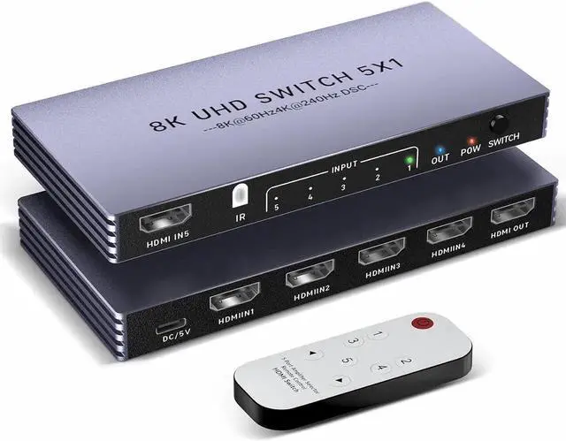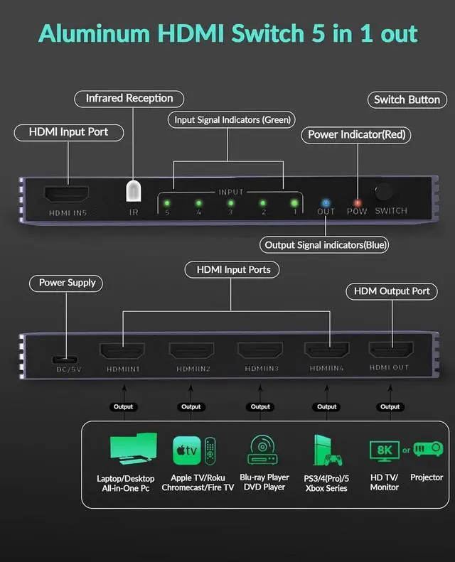 5 In 1 Out HDMI Switch: This 5 port HDMI switch allows you to connect up to five HDMI devicessuch as PS5, Xbox, Nintendo Switch, Roku, and laptopsto a single display. Effortlessly switch between gaming, movies, and presentations with the included remote or manual button. Five LED indicators clearly show the active source, making this 8k HDMI splitter ideal for home entertainment, office meetings, and conference rooms.