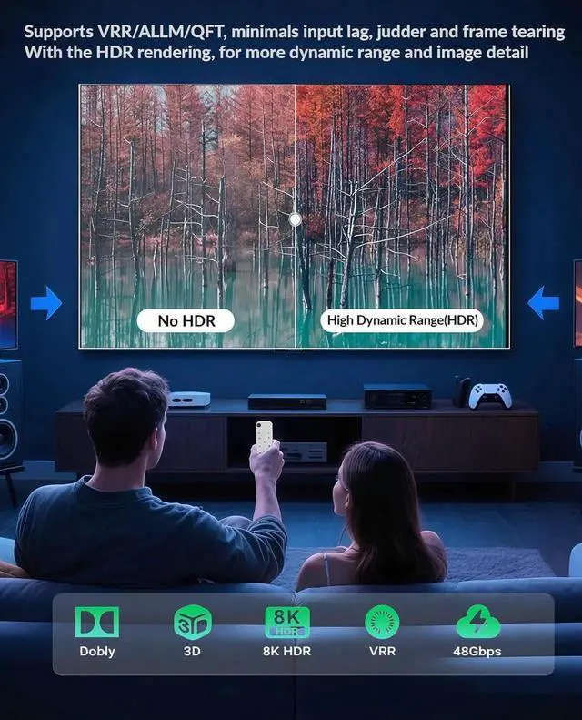 8K HDMI Switch & High Refresh: Engineered with advanced HDMI2.1 technology, this 4K 240Hz HDMI switch supports breathtaking resolutions including 8K@60Hz and 4K@240Hz, along with backward compatibility for 4K@120Hz and lower. Enjoy buttery-smooth gameplay and immersive visuals with support for VRR, HDR10+, Dolby Atmos, 3D, and HDCP 2.3. Note: For optimal performance, use HDMI cables under 2M and ensure source and display devices support HDMI 2.1.