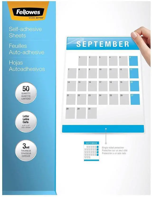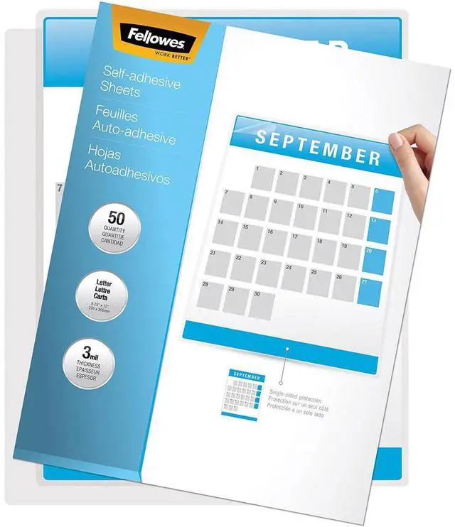 Fellowes Self-Adhesive Laminating Sheets are convenient and easy to use. One sheet laminates single-sided documents and two sheets laminate double-sided documents. Can be trimmed to fit various document sizes. Not for use with a laminator.