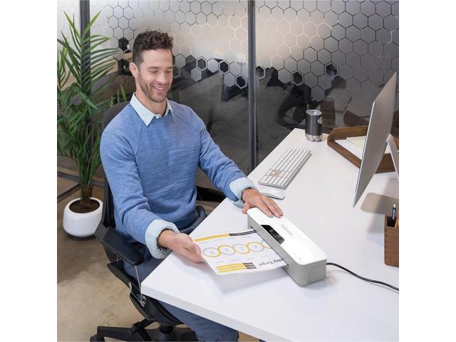 - White/light gray thermal and cold laminator for use with laminating pouches to protect documents. Auto Shut off saves energy and prevents overheating.