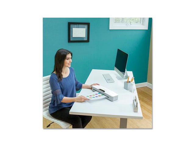White/light gray thermal and cold laminator for use with laminating pouches to protect documents. Auto Shut off saves energy and prevents overheating.