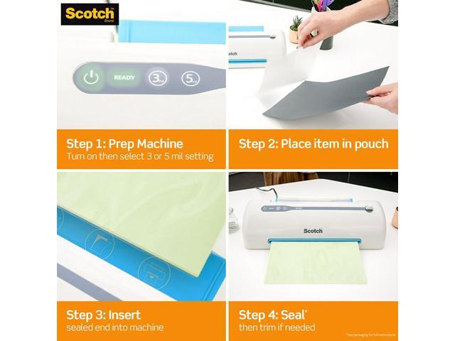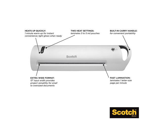- 1 minute warm up time reduces wait time makes laminating more efficient. Includes convenience features like carry handle, cord storage, and auto-shut off. For best results, use with Scotch Brand Thermal Laminating Pouches that provide an ultra clear finish to let important information show through.