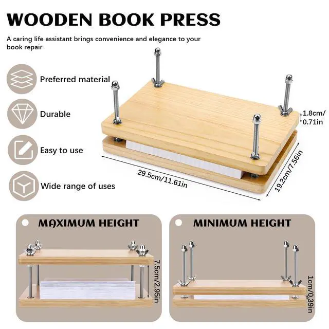 | made of premium wood | book press for DIY | Large Book Press | has a special 2-layer feature | can bind books and punch holes | 3 types of awls can be used | provide a instruction manual |