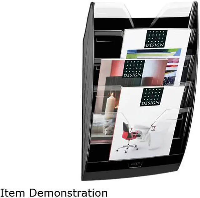 Stylish, wall display rack securely stores heavy loads with a sturdy construction so you can keep all your essential files close in the five compartments. Heavy-duty, one-piece body is made of recyclable, shock-resistant polystyrene. Crystal dividers include a cutaway front section for easy access. Wall file accepts large and thick documents up to 9-4/9" x 12-3/5", and items can be stored vertically or horizontally. Several units can be interlinked and mounted above each other or side by side to create a bank of wall files. Wall fixing kit is included.