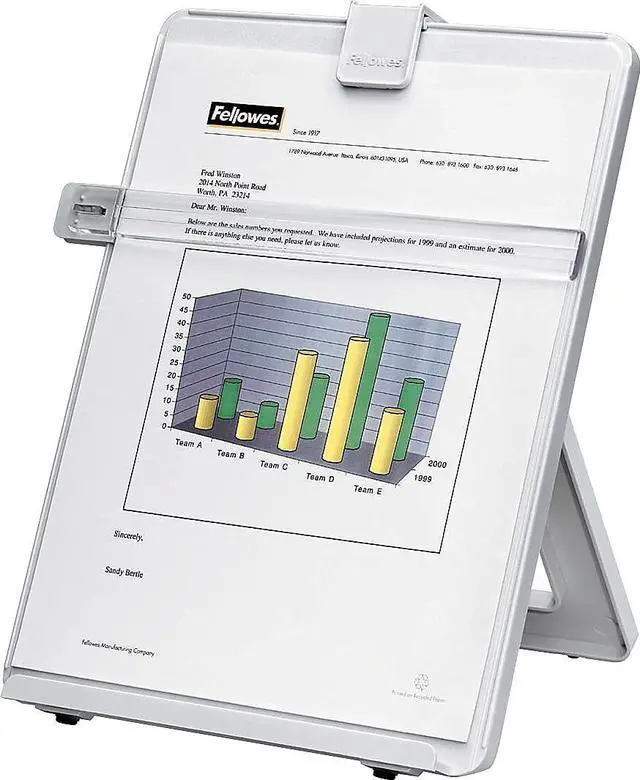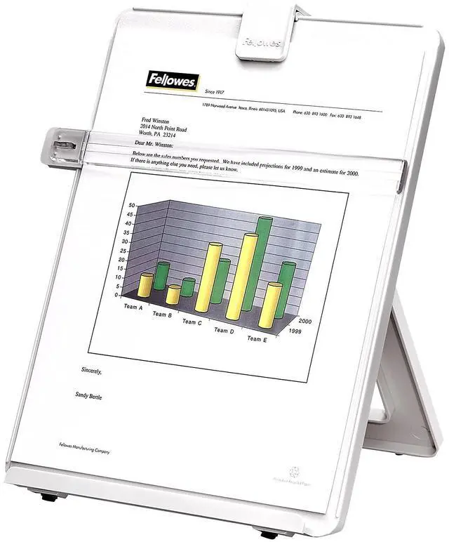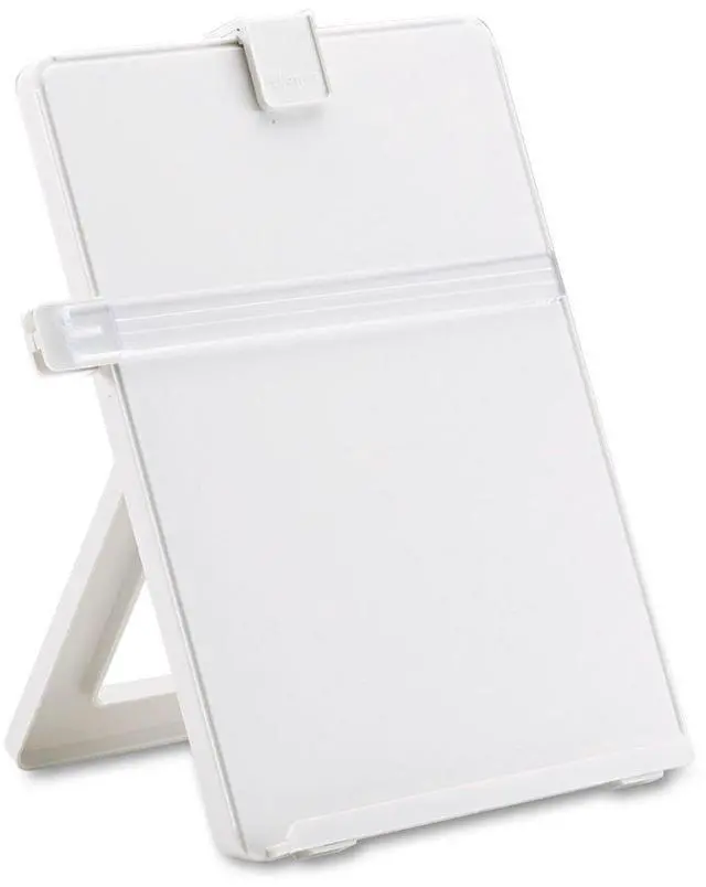 Places documents at eye-level to help prevent neck strain while improving comfort and efficiency! This model features adjustable tilt for a customized viewing angle, and includes a removable line guide magnet to hold documents securely in place. Durable metal construction ensures lasting performance. Folds flat for easy storage. Holds up to 200 sheets of letter size paper.