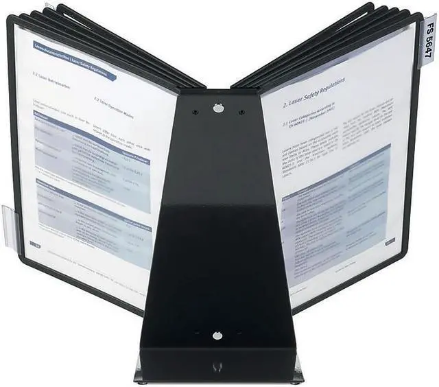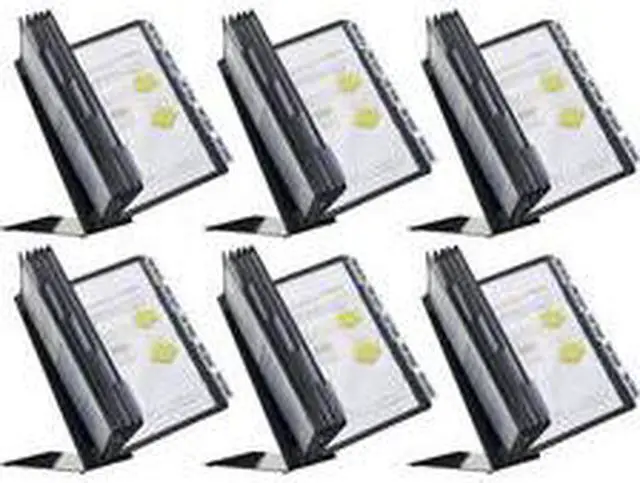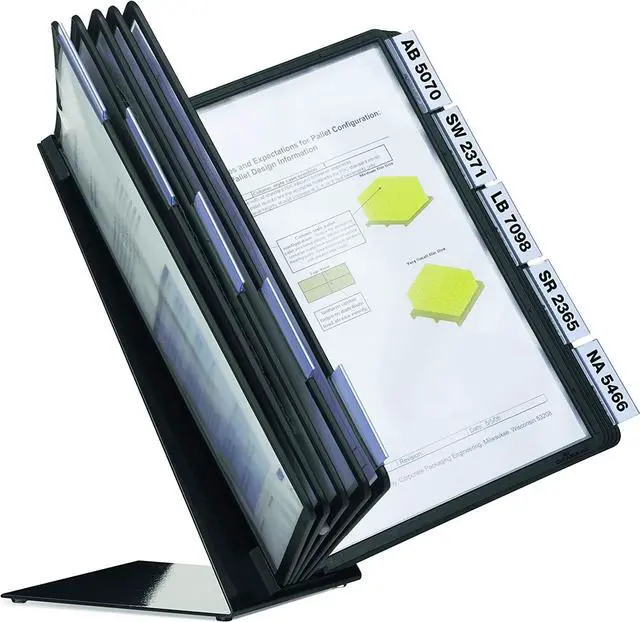 - Includes 10 easy-load pockets with black frames, 10 snap-on tabs, bracket, and a non-slip steel desk stand.