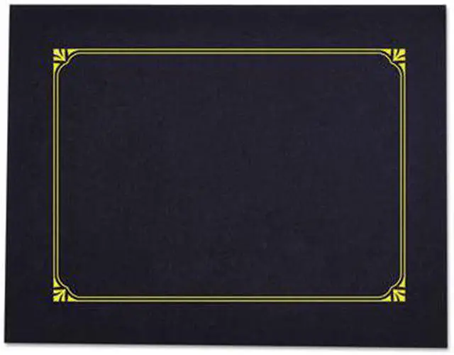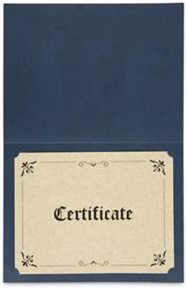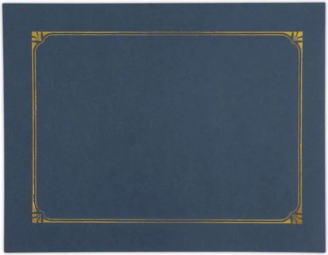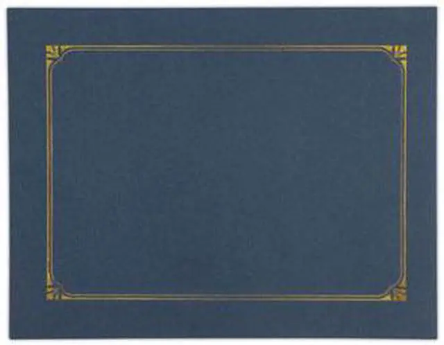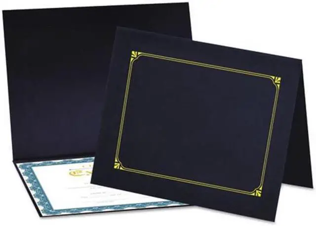 This premium document cover provides an elegant touch to any certificate or award presentation. The heavy-duty cover features a linen textured finish and a gold foil border design for a classic and elegant look. Includes die-cut tabbing to hold 8.5" x 11", 8" x 10" and A4 certificates. Includes link to create custom award certificates. Overall size is 125" x 9.75". Color(s): Navy; Width: 9.75"; Height: 12.5"; Insert Size: 8.5 x 11; 8 x 10; A4.