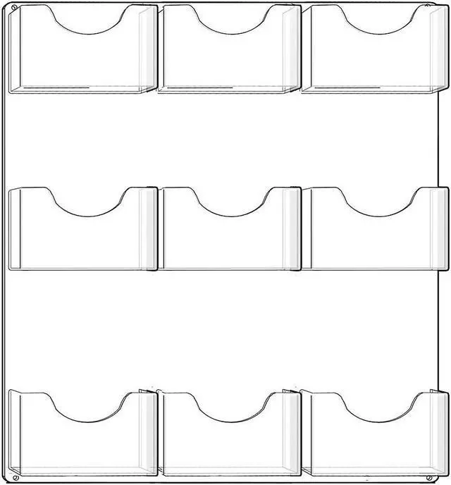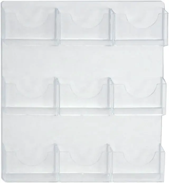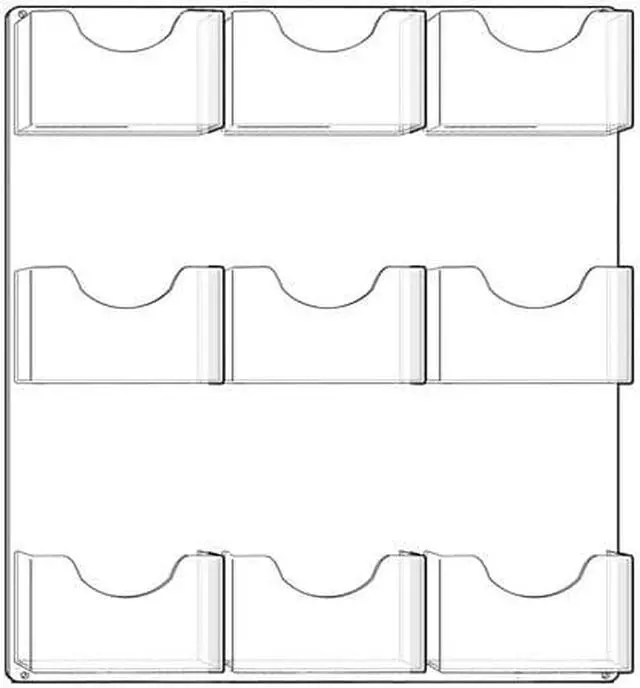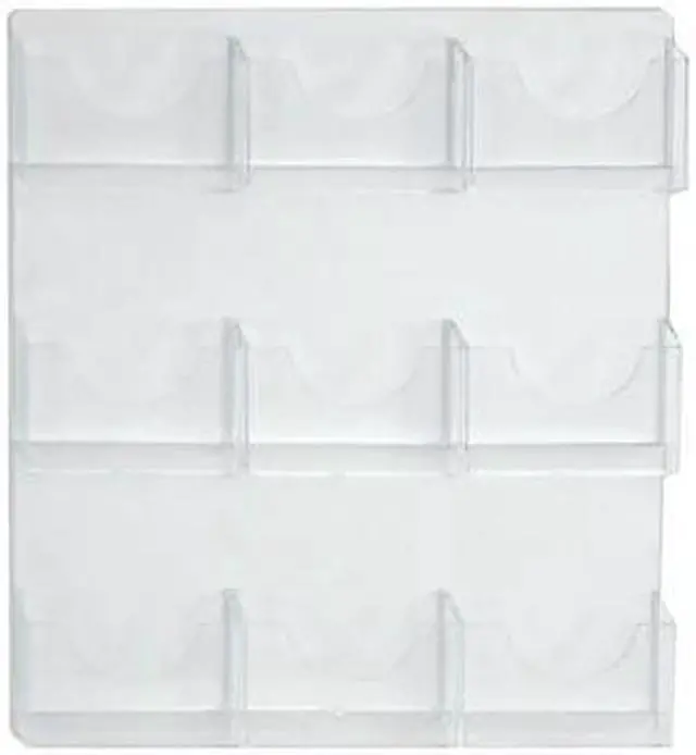Nine-pocket bifold wall mount brochure holders with clear acrylic backing. Add hardware for gridwall, pegboard, slatwall, or glass installations (hanging hardware sold separately). Overall dimensions are 19.5"W x 24"H, each pocket dimensions is 6.25"W x 1.125"D x 4.125"H.