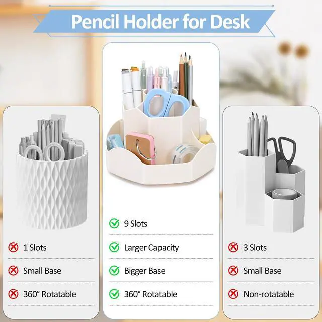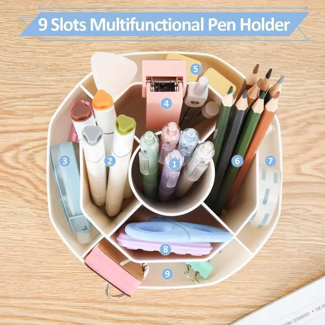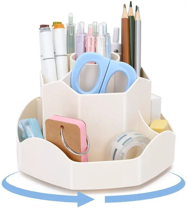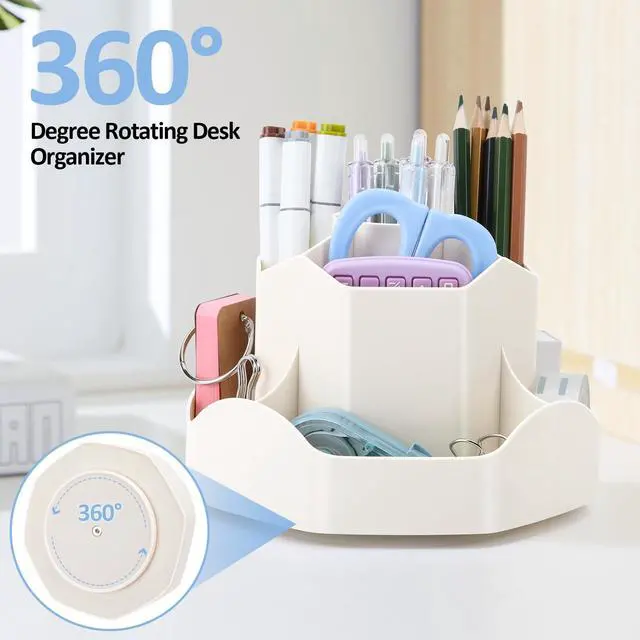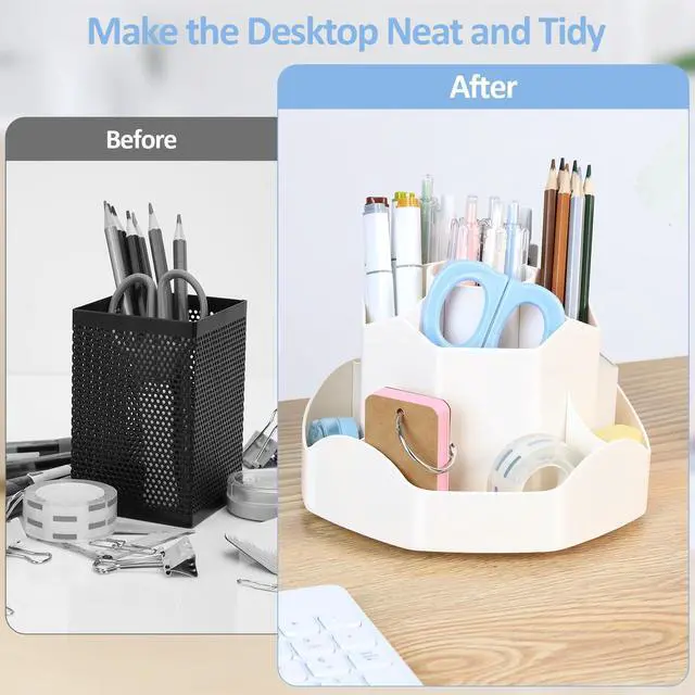 360°Rotating Pen Holder: This desktop organizer can be turned up to 360-degree rotation to the left and right. It spins smoothly all around without getting stuck. Keeps your stationery supplies neat and tidy and can be accessed from any angle