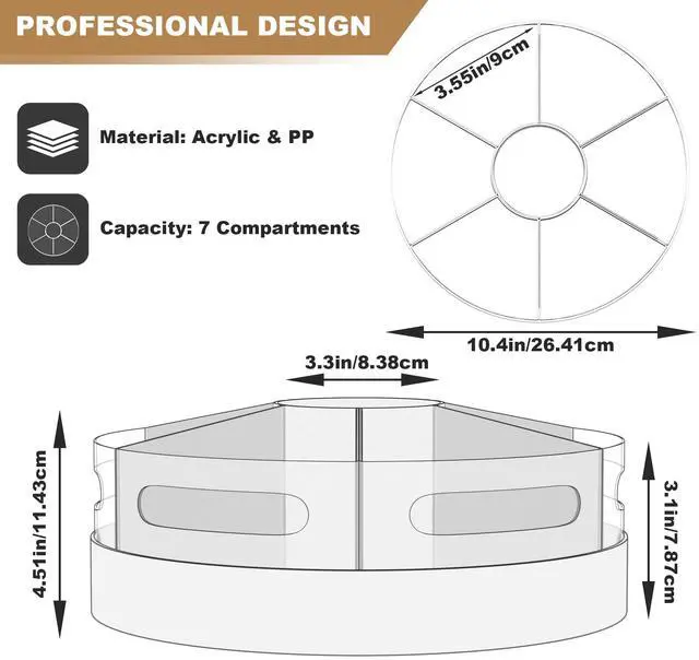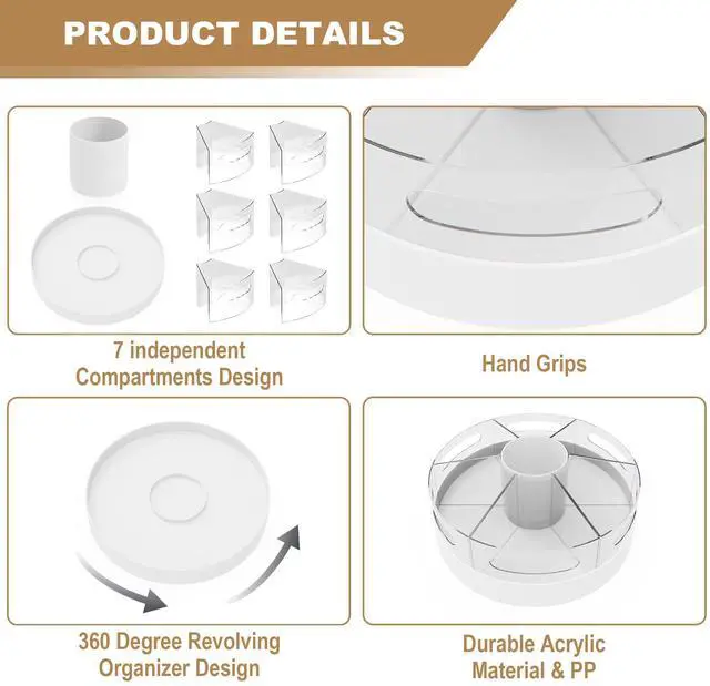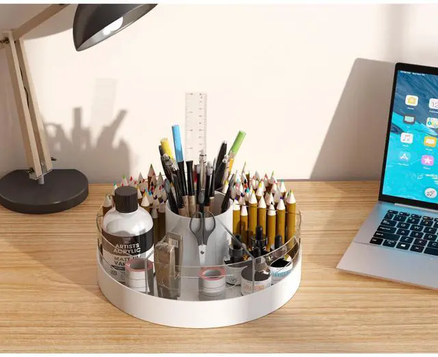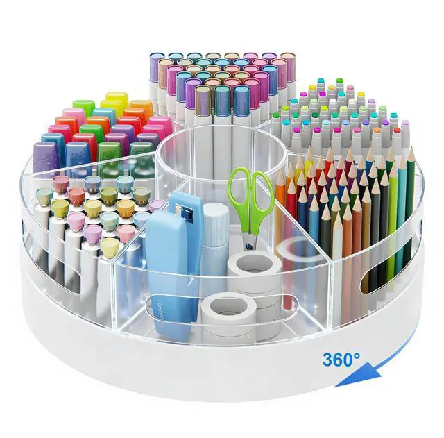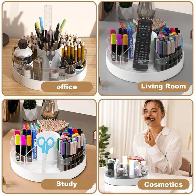 This 360° rotating pen organizer features a white plastic base and clear acrylic compartments, with 7 removable sections for versatile storage of stationery, art supplies, or makeup tools. The smooth rotation provides easy access to all items, helping keep your desk neat. Ideal for use at home, in the office, or in the classroom.