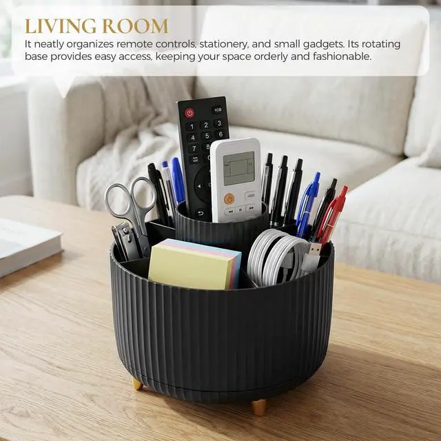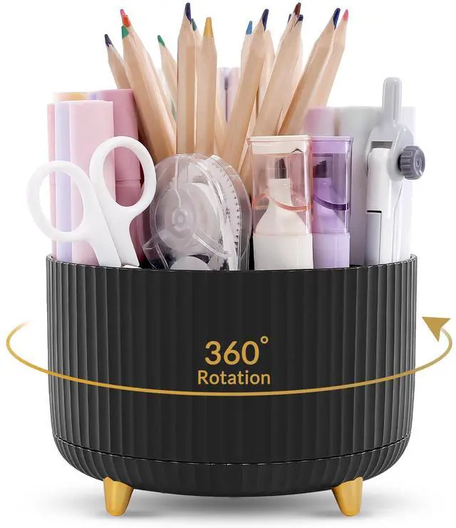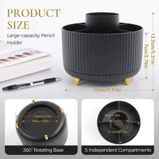 The 360-degree rotating pen holder has 5 independent compartments, maximizing storage space and keeping the office desk clean and tidy. It can not only store office stationery, such as pens, pencils, scissors, sticky notes, rulers, etc., but also store mascara, Makeup tools such as concealer and eyebrow pencil have a delicate and beautiful round design. You can rotate them to any angle to easily store or take out what you want.