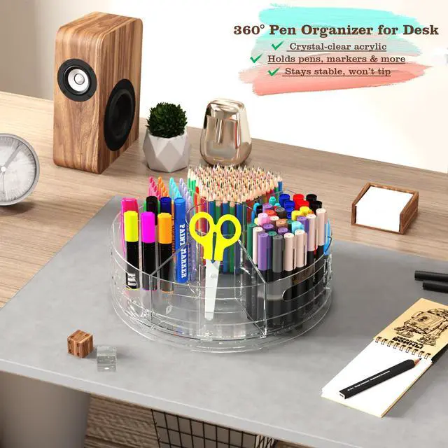 Rotating Desk Organizer, 360° Acrylic Pen Organizer for Desk with 7 Removable Compartments, Extra-Large Pen Holder for Office Supplies, Markers, and Art Supplies, Clear Pencil Holder
