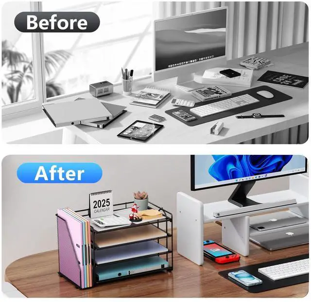 Enhanced with multi-tiered storage for optimizing desktop space, boosting work efficiency, and boasting a minimalist design that complements diverse office styles, enhancing desktop aesthetics.
