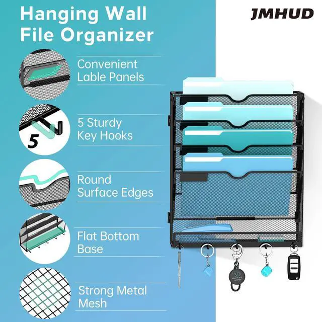 Introducing JMHUD upgraded wall file organizers! This wall organizer comes with a base and hooks to maximize space utilization. The file organizer can be easily mounted on the wall to easily hold folders, documents, mail and other items.