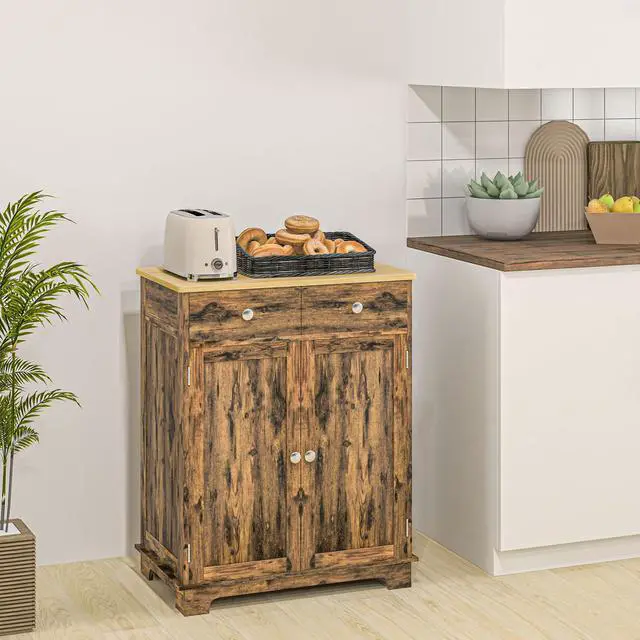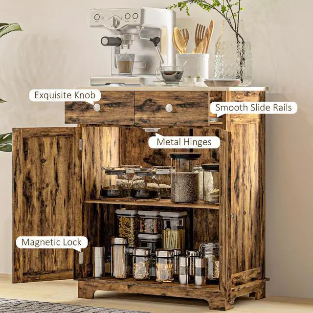 • Sideboard with Solid Wood Countertop, Modern Kitchen Storage Cabinet, Coffee Bar Cabinet with 2 Drawers, Doors and Adjustable Shelf, Rustic Brown