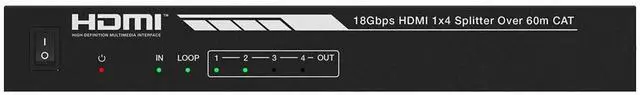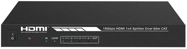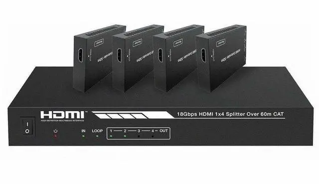 This 4K HDMI 1x4 Splitter/Extender allows you to distribute a single HDMI video source to up to four distant displays. It can extend 4K@60Hz signals to distances up to 114 feet (35 meters), 4K@30Hz signals to distances up to 164 feet (50 meters), and 1080p@60Hz signals to distances up to 196 feet (60 meters) over a single Cat6/6a/7 Ethernet cable. It supports up to 7.1 -channel audio pass-through, can extract the audio for separate amplification, and features advanced EDID management. It supports the Power over Cable (PoC) feature, allowing the receivers to be powered by the transmitter over the Ethernet cable.