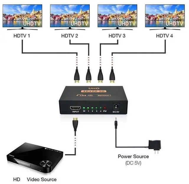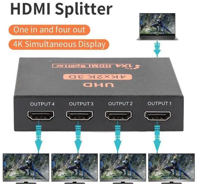 Easy to useThis 1 in 4 out HDMI splitter is easy to operate, split 1 HDMI input signal to 4 HDMI output signals all are identical easy to use, takes only seconds to install
