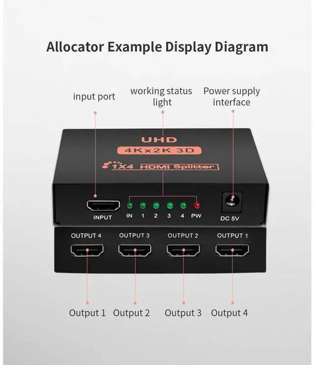 Package Include 1 x HDMI splitter, 1 x 5V/1A power adapter, 1 x user manual. Can be widely use in trade show, conference room, education and training, home theater and multimedia teaching.