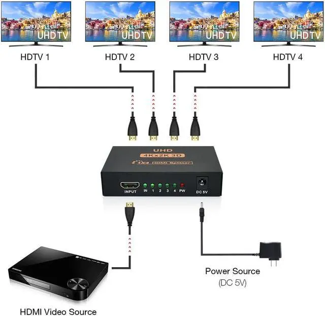 1x4 HDMI splitter distributes Audio and video signal from one single source to two different HDMI displays simultaneously, present you high quality video/audio without lag, flash, drop in resolution. You can enjoy the TV in the living room and the bedroom at the same time.
