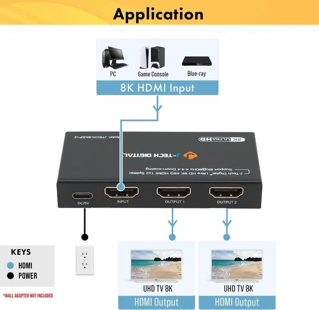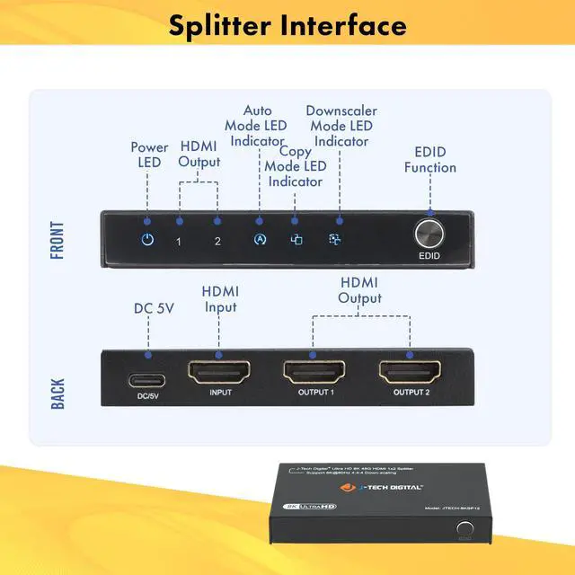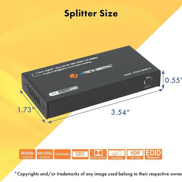 HDMI 2.1 Splitter 1 In 2 Out, 4K 120Hz 8K 60Hz 4:4:4, Supports 8K Downscale To 4K / 1080P, 3 EDID Modes, HDCP 2.3, Compatible with HDR & Dolby Vision by J-Tech Digital [JTECH-8KSP12]