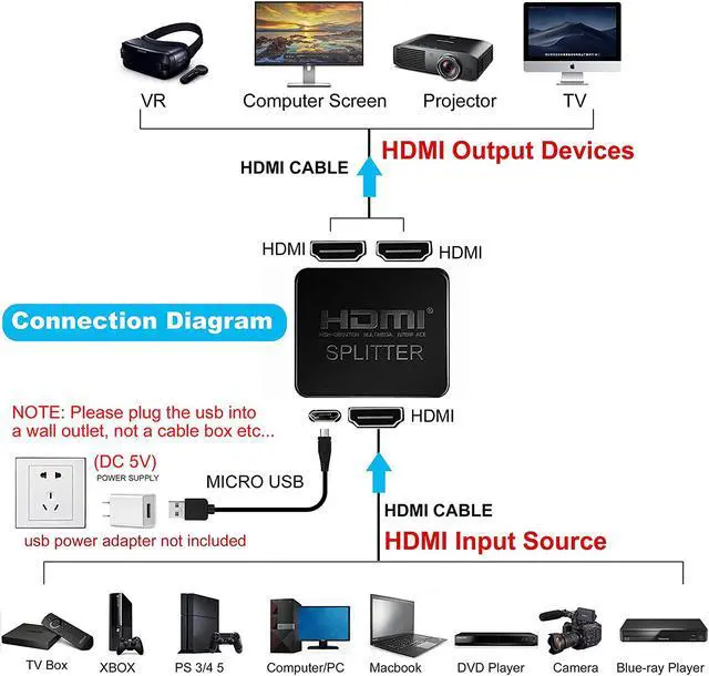 This 4k HDMI splitter is easy to install & operate, Just connect your HDMI devices and the USB charger cable (Does not come with adapter) to enjoy.