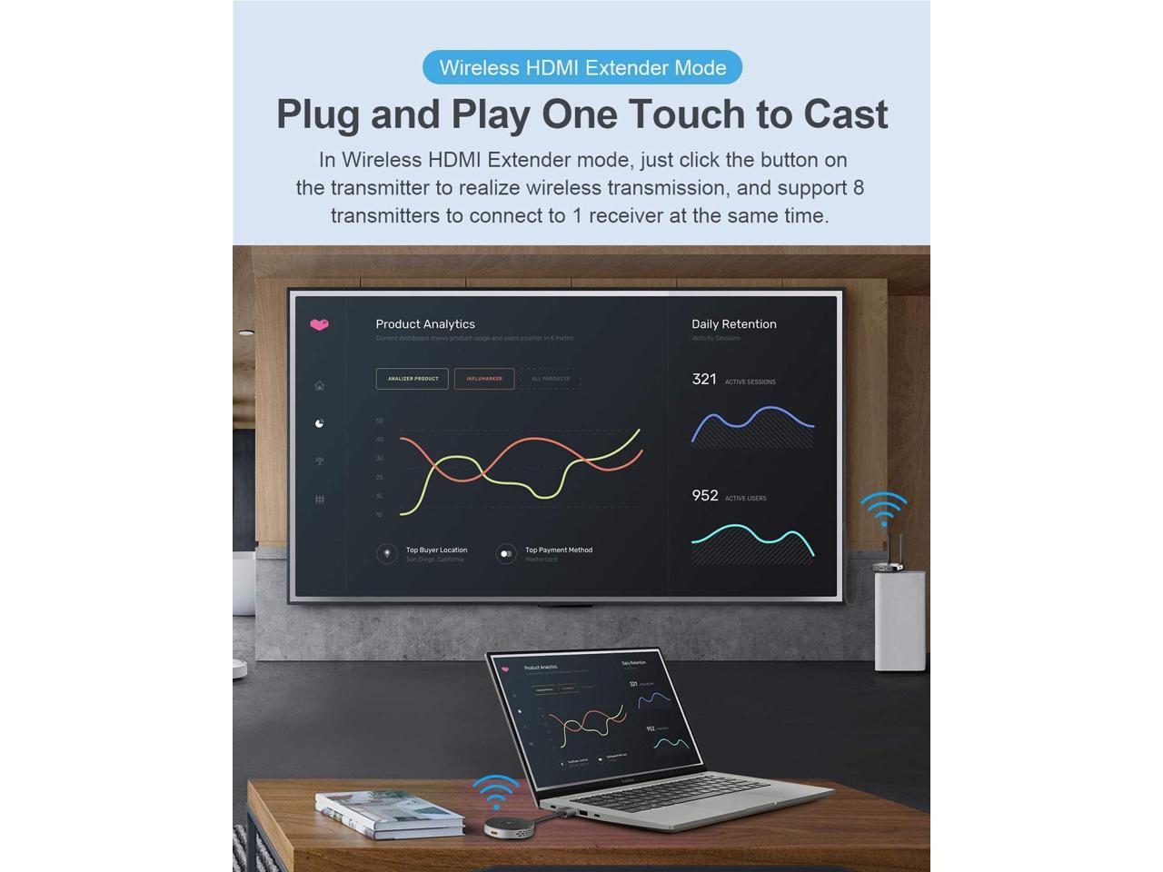- ?No WiFi Required?Place a TV anywhere within 164 feet from the source with included transmitter and receiver. Simply connect the transmitter to a set top box, gaming console, or other HDMI output device and connect the receiver to any HD display.