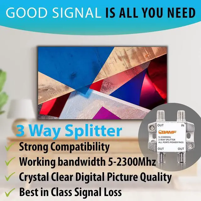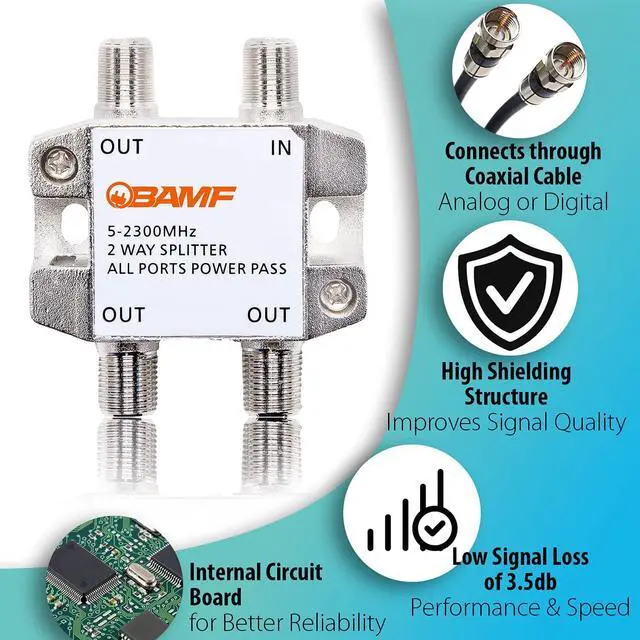 5-2300 MHz ( 2.3GH z) RF Bi-Directional Digital Coax/ Coaxial Cable Splitter for CATV and Satellite and great for MoCaInternal circuit board for better reliability/durability. Outside is weather resistant design for keeping elements outLow signal loss of only 5.5 db on each output port improving performance and speedsAll Ports are Power passing for easy Satellite connection Also works great for Cameras and for AmplifiersHigh shielding structure lowers digital noise and improves signal quality reducing packet loss for Modems and for all other Devices