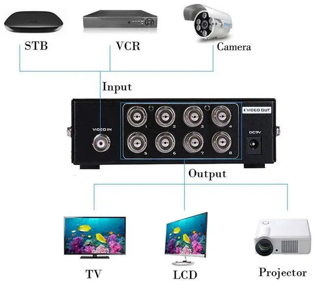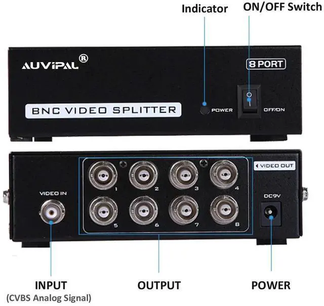 1 in 8 out BNC splitter receives one BNC input and retransmits the signal to 8 BNC outputs for real time viewing across multiple displays. It's particularly ideal for surveillance systems,TV studio, digital cinema, or any AV application where you need to split signals from a camera or other device equipped with BNC outputs to 8 BNC-compliant displays or video processors.
