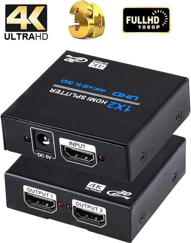 HDMI Splitter 1x2: HDMI Splitter 1x2 distributes 1 HDMI source to 2 HDMI displays simultaneously. It has the ability of buffering and amplifying to achieve longer transmission distance of HDMI signal