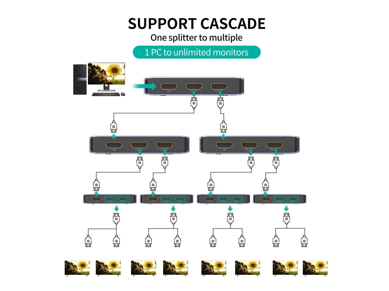 - Ultra HD 8K@60Hz & 4K@120Hz HDMI Splitter Supports high-resolution video duplication, delivering crisp, lag-free visuals for gaming, streaming, and professional setups.