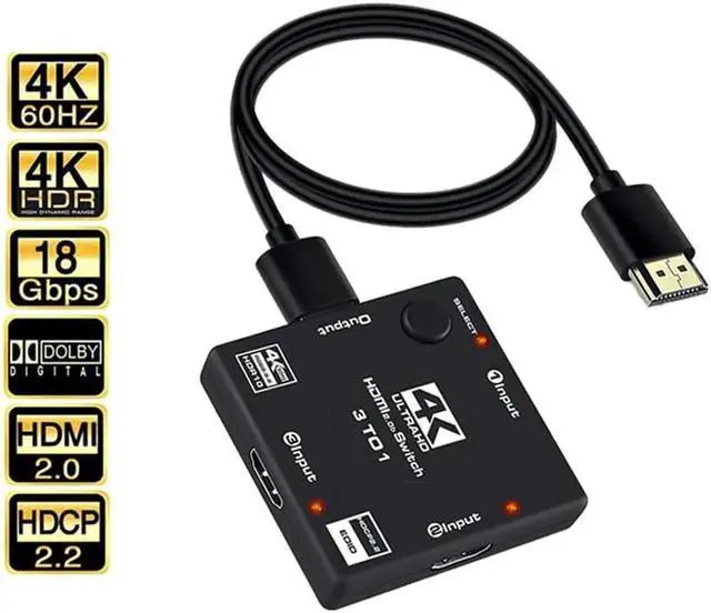 • HDMI Switch is a 3 port HDMI 2.0b 4K HDMI switcher for your latest gaming and home theatre setup. It supports 3 HDMI inputs and 1 HDMI output, allowing for HDMI 2.0 and HDCP 2.2, along with 4K Ultra HD and compatibility on all HDMI.