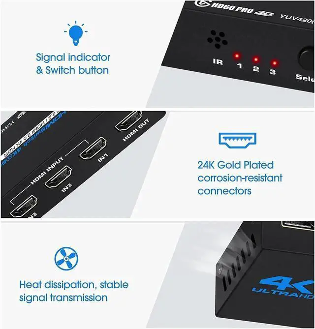 - 4K ULTRA HD RESOLUTION: 3 Ports HDMI Hub support HDMI Output Video - 4K/60/24Hz, 2K/60/30/24Hz, 3D, 1080P, 1080i, 720P, 720i, 576P, 576i, 480P; Support HDMI Output Video Up to 4K x 2K (3840 x 2160) 60Hz (Max). Support 3D, Supports 12- bit Deep Color, Compatible With HDMI 2.0, HDCP 2.2.