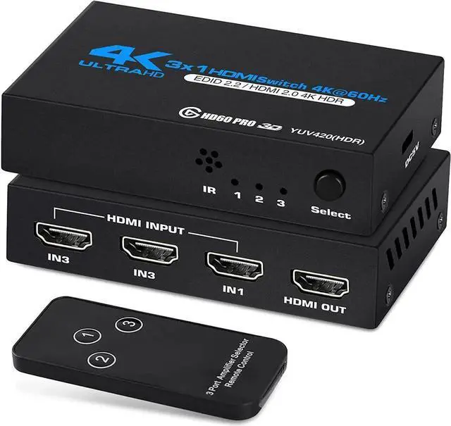 HDMI 2.0 Switch Splitter 3 Port 4K HDMI Switcher 3 in 1 Out Metal HDMI Switches Selector Box with IR Remote Control Support HDCP 2.2 Support 4K@60Hz Ultra HD 3D 2160P 1080P