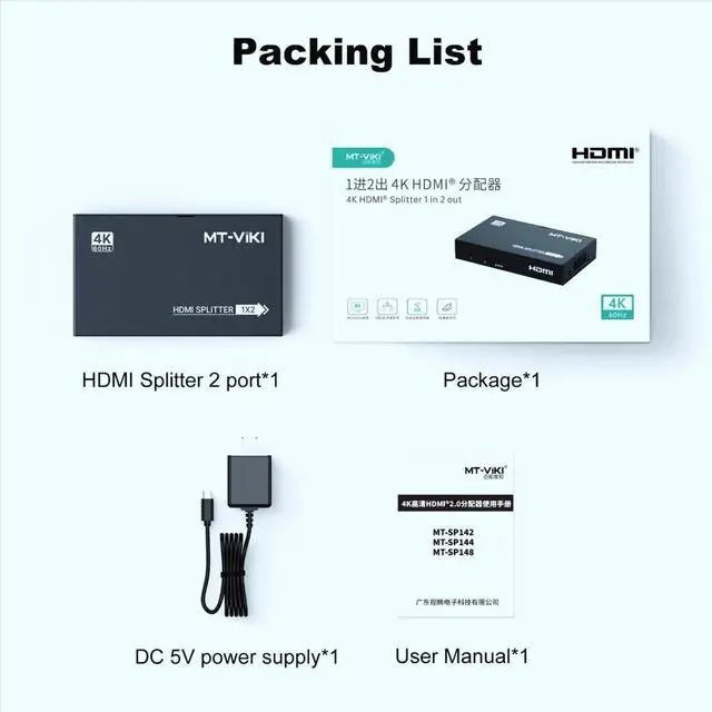 Package: 4K@60Hz HDMI Splitter 1 in 2 out *1, AC Power adapter*1; MT-VIKI also provide 4K/8K HDMI splitter 1 in 2 out, 1 in 4 out, 1 in 8 out, and 1 in 16 out