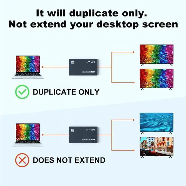 Important Warning: 1. Not Extended, It does not extend separate content to two monitors; 2. Not an HDMI Switcher: It does not support connecting two HDMI input signals to one monitor.; 3. Not an audio extractor, It is not compatible with connecting to any audio devices, such as soundbars.; 4. ARC/eARC Not Support.
