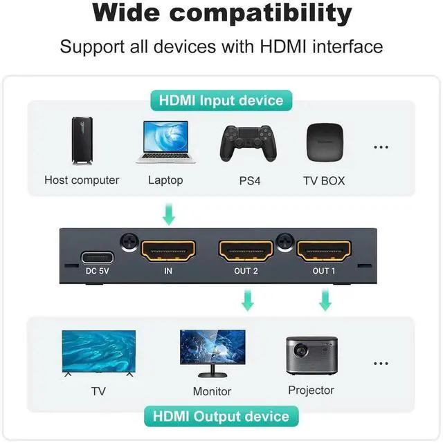 High Compability: This powered HDMI splitter support output 4K 60 HDCP 2.2, input support: computer, PS3, PS4, Xbox, Blu-ray DVD player, STB any standard HDMI version work with HD TV & monitor with HDMI port