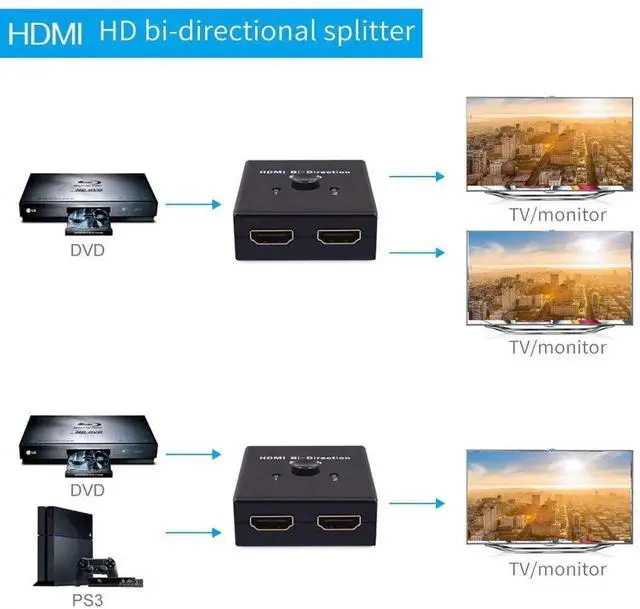 You can easily use the buttons on the product Enables switching between switchers and distributors. It can make the HDMI signals of high-definition TV set-top boxes, DVD players, D-VHS projectors and other HDTV equipments distribute two consistent and synchronized HDMI signal outputs. The single-channel signal output by the user can be connected to audio and video equipment such as high-definition projectors, DLP, and LCD high-definition televisions. And it conforms to the HDMI2.0 standard, while supporting the 3D function of the HDMI1.4 version, compatible with the HDCP protocol. It can also display 3D output with vertical pixels up to 2160 lines, and supports 3D devices such as Blu-ray and PS3.