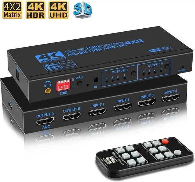 - What You Get: 1 x 4K@60Hz HDMI Matrix 4 in 2 out, 1 x IR Remote Control, 1 x 5V/A Power Adapter, 1 x User Manual.