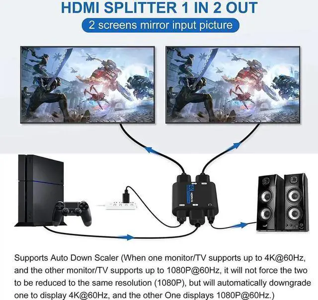 Supports Auto Down Scaler (When one monitor/TV supports up to 4K@60Hz, and the other monitor/TV supports up to 1080P@60Hz, it will not force the two to be reduced to the same resolution (1080P), but will automatically downgrade one to display 4K@60Hz, and the other One displays 1080P@60Hz. )