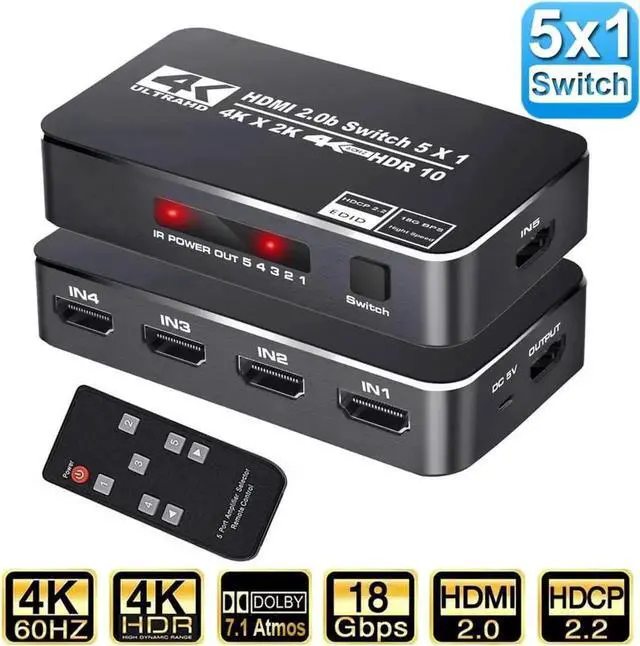 5 Ports HDMI 2.0 Switch Supports 4k@60Hz, HDR10, HDCP 2.2/1.4, RGB(4:4:4) for Apple TV, PS3/PS4, DVD player, projector, Blu-ray players, PlayStation, Xbox, Fire TV and Stick, and other HDMI devices.
