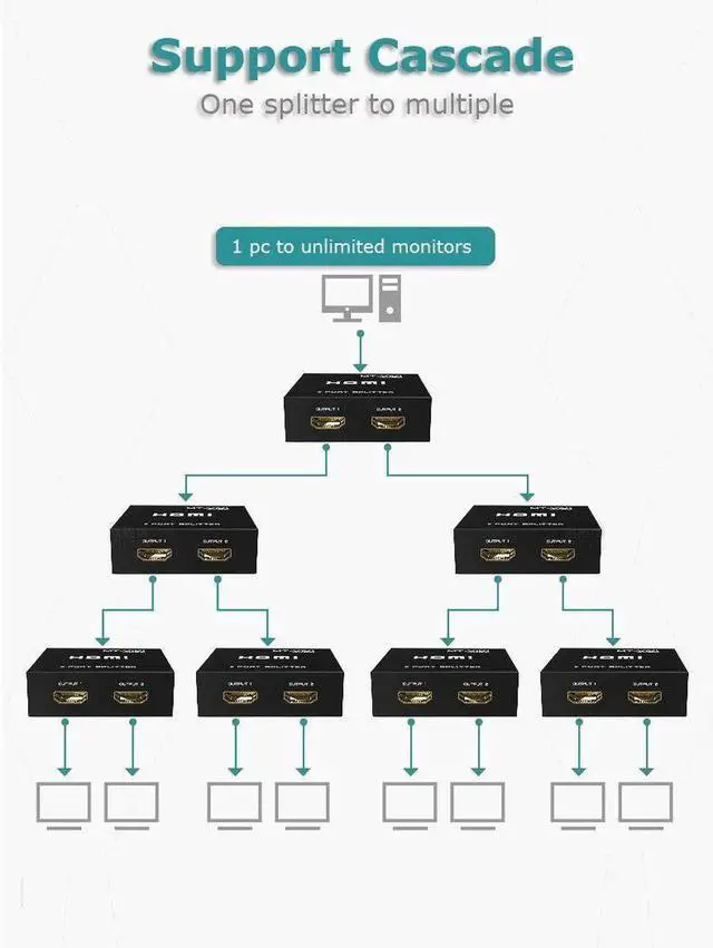 1. if the resolution of the 2 monitors is different like 720P and 1080P, it automatically outputs the lower resolution 720P on bother monitors. So 4K monitors are prefered as this splitter is 4K splitter.